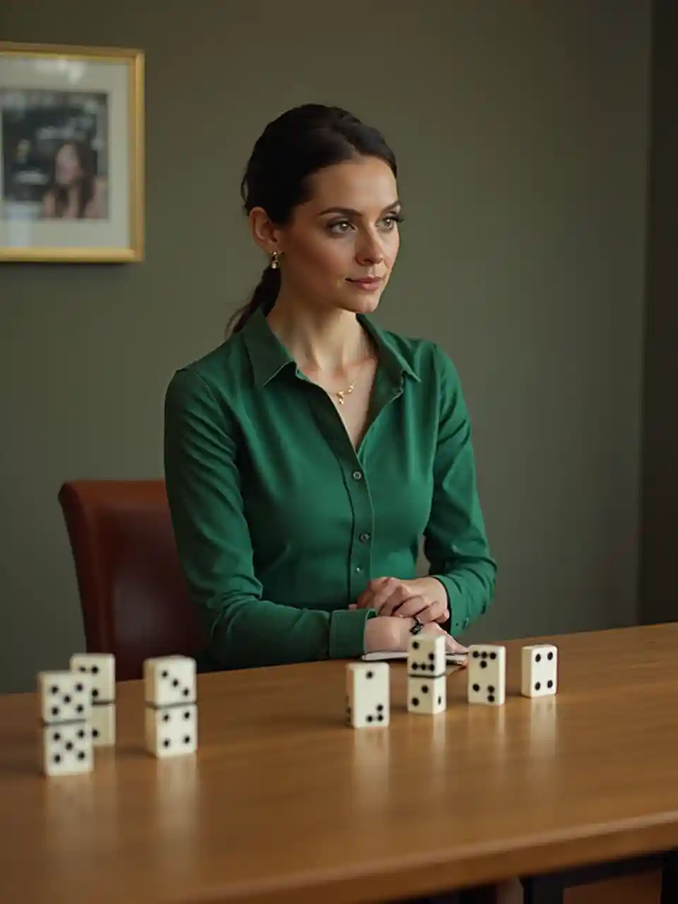 En tøff og herskende kvinne i midten av førtiårene satt alene ved et møte i en grønn kjole. Det er ingen andre i rommet. Det er dominoer på bordet.