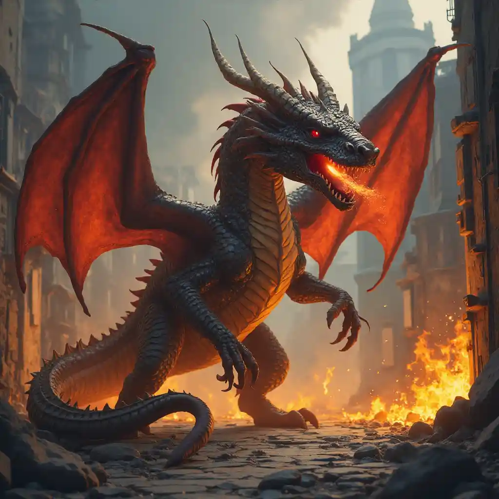 En fryktinngytende drage slenger sin ild ut i byens gater