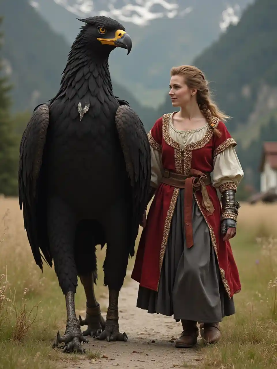 JamesRepresentere Østerrike med et dyr og en ekte kvinne som går ved siden av den → Det bør være en svart ørn kledd i middelaldersk klær og går ved siden av henne som han beskyt henne