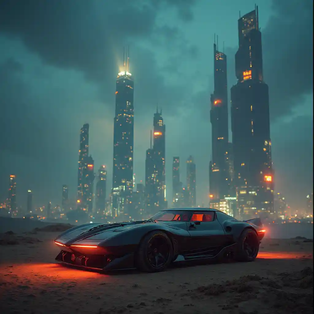 Eastonscience fiction, natt, filmatisk fotografi, futuristisk design av elektriske biler, majestetisk, ørken by, ødelagt skyskrapere, perfekt belysning, skyer, levende, film korn