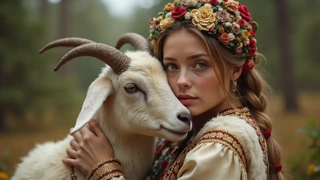 PianeerPortrett av en vakker kvinne fra russisk eventyr iført tradisjonelt kostym og klem på en geit