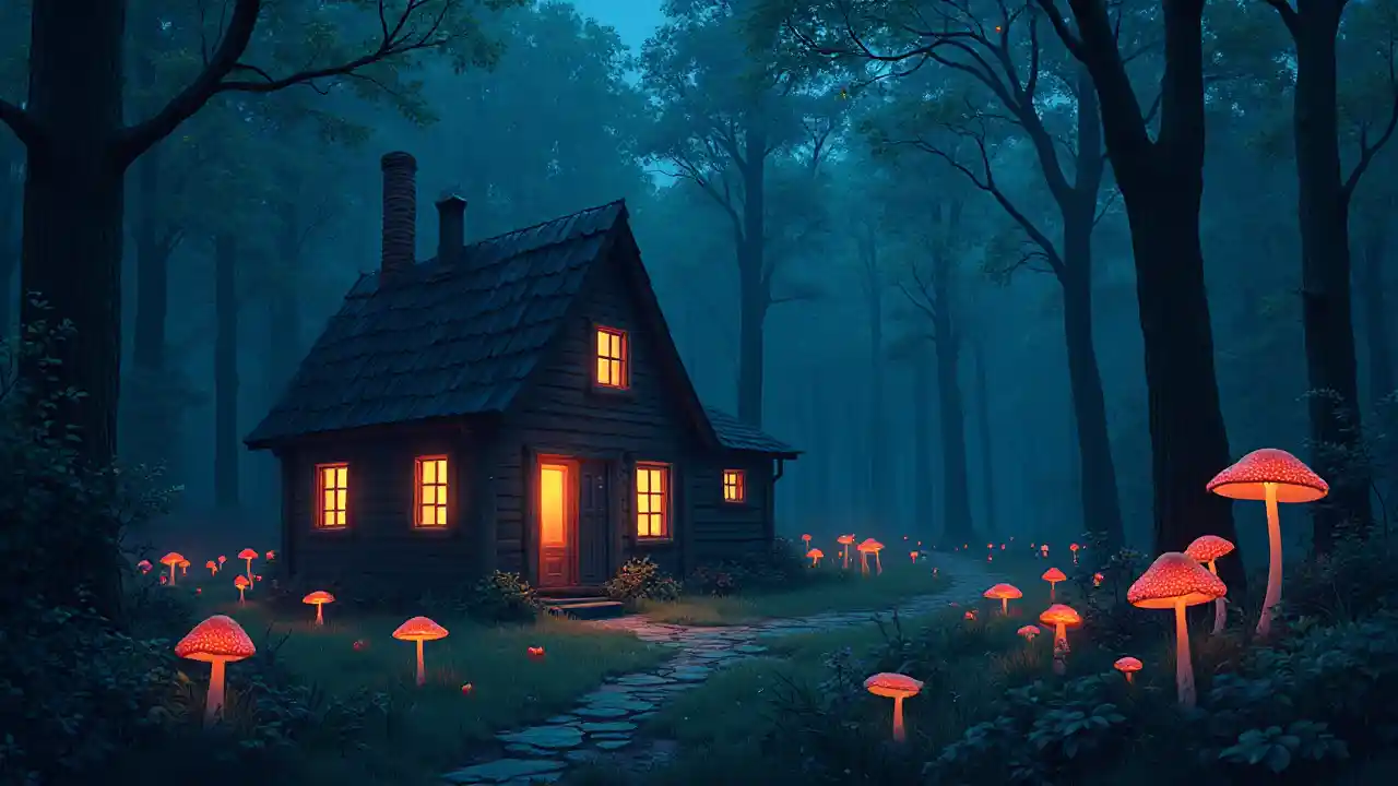 Huset i skogen, mørk natt, blader i luften, fluorescerende sopp, dyr, gibli, atey ghailan, lois van baarle, jesper ejsing, ernst haeckel, pop art mønstre, utsøkt belysning, klart fokus, veldig sammenhengende, veldig detaljert, kontrast, digital maling