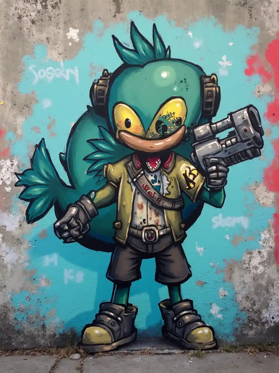 Graffiti kunst av Fortnite Fishtick karakteren på en vegg med spray kan.