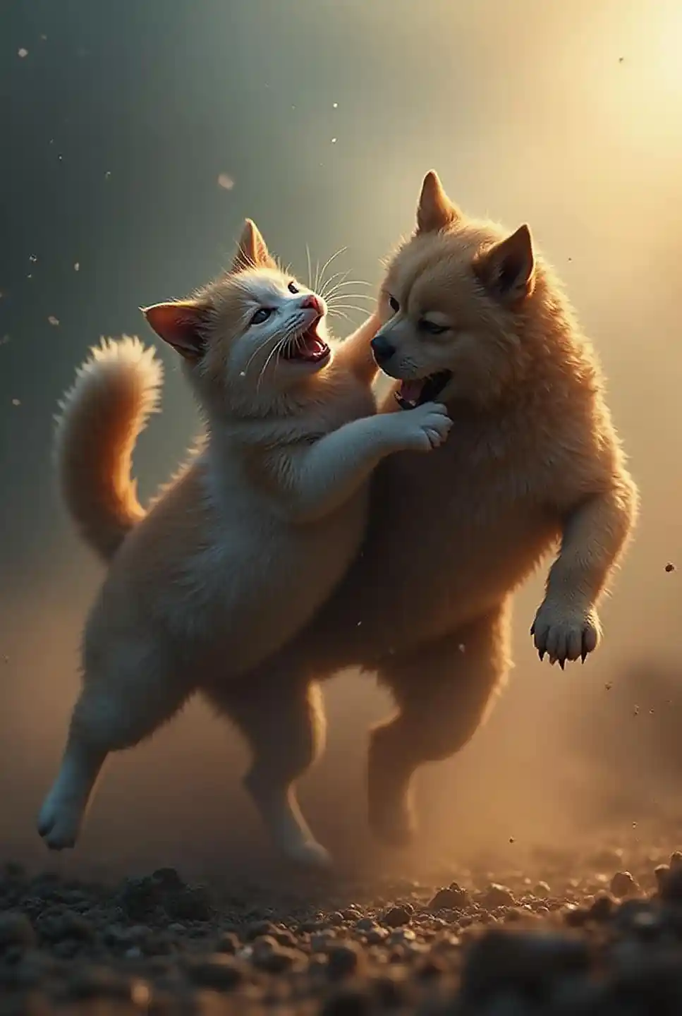 Avaepisk kamp, katt mot hund krig, søt pels kaos, sakte handling, 4K opplæring, filmisk belysning, klør ut, dramatisk slagmark, røyk og laser