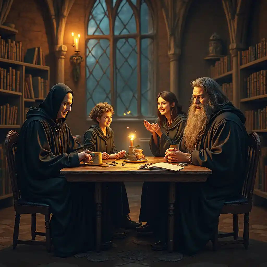 Et koselig, stearinlys rom på Hogwarts. Fire figurer fra Harry Potter-universet sitter rundt et trebord. Professor Snape sitter med et strengt, kontemplativt uttrykk, kledd i sine mørke klær. Luna Lovegood er overfor ham, drømmende og rolig, med sine skøre tilbehør. Hagrid, massiv og varm hjerte, sitter på den ene enden av bordet med en kopp i hånden, ler. Sorteringshatten er plassert på en pute ved det gjenværende setet, animert og taler med sin karakteristiske visdom. Atmosfæren er magisk og litt sjokkerende, med svømmende stearinlys og fortryllede bøker som svømmer i nærheten.