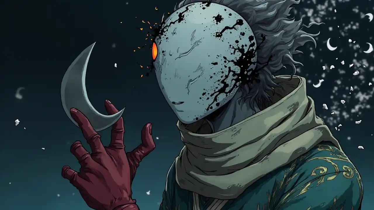 Lag en mørk illustrasjon av en Hullformet form av en Shinigami i BLEACH universet, med Zanpakutō 'Tsuki no Uramen'. Den Hull masken er en halvmåne vendt ned, som dekker høyre side av ansiktet, med asymmetrisk design, subtile sprekker som tørr tår, ugjennbar hvit keramisk tekstur, og mørke mønster på kantene. Det synlige øyet lyser dypt rødt, noe som uttrykker følelsesmessig sammenbrudd. Shinigamis klær, opprinnelig farget, tar til seg forvrengte toner: grått og gull forvandlet til flekket kobber. Sjallet er blek og tungt, som om det var vått. Røde hansker får svarte klør, noe som tyder på et aggressivt forsvar. Zanpakutô har et krøvet, ugjenskuelig blad, som en månens skygge, som avgir en hule lyd når den skjærer gjennom stillheten. Auraen mørker miljøet, simulerer en delvis formørkelse, med svarte partikler som månese, som symboliserer fragmenter av den følelsesmessige masken som faller fra hverandre. Bakgrunnen er nattlig, med tett åndelig energi og subtile shinigami symboler. Anime stil, inspirert av Tite Kubo, med presise linjer, kontrasterende farger og eterisk og mørk atmosfære, fremheve dualiteten mellom skjult skjønnhet og ustabel kraft