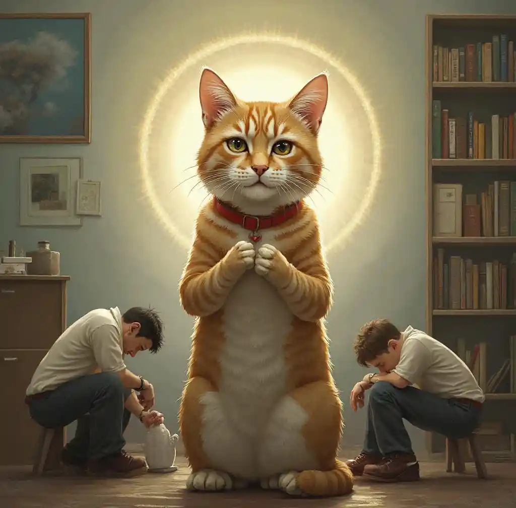 (Høy kvalitet, mesterverk, super detaljert, høy oppløsning), ((hold opp en katt)), ((en halo skinner bak katten)), ((kontorarbeidere bøyer seg)),(Katten