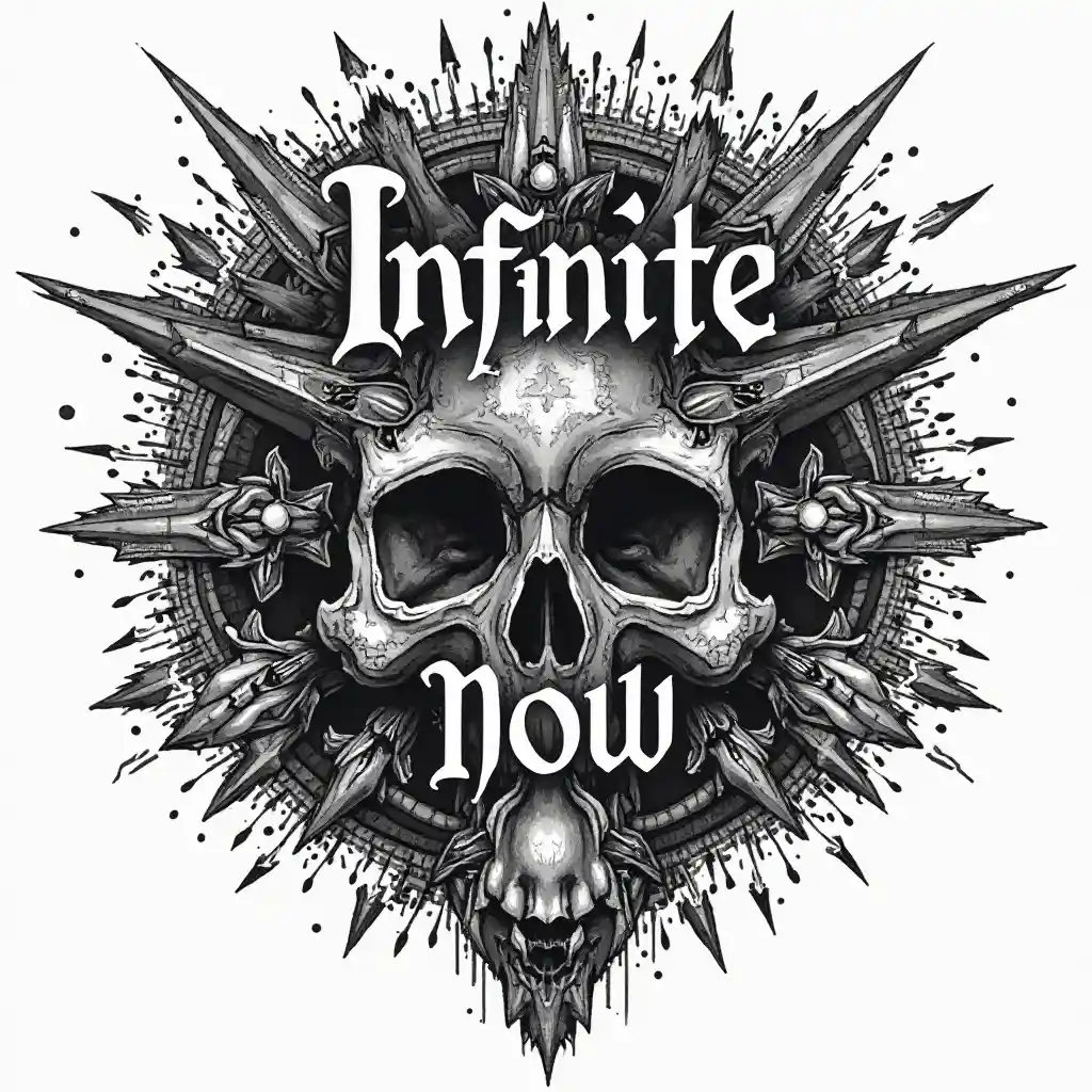 stxphKunstverk i okkult stil i svart og hvitt. Teksten bør være "Det uendelige nå" i en gammel stil. Geometriske abstraksjoner bidrar til å legge til mystikk. Inkludere hodeskaller og skjeletter.