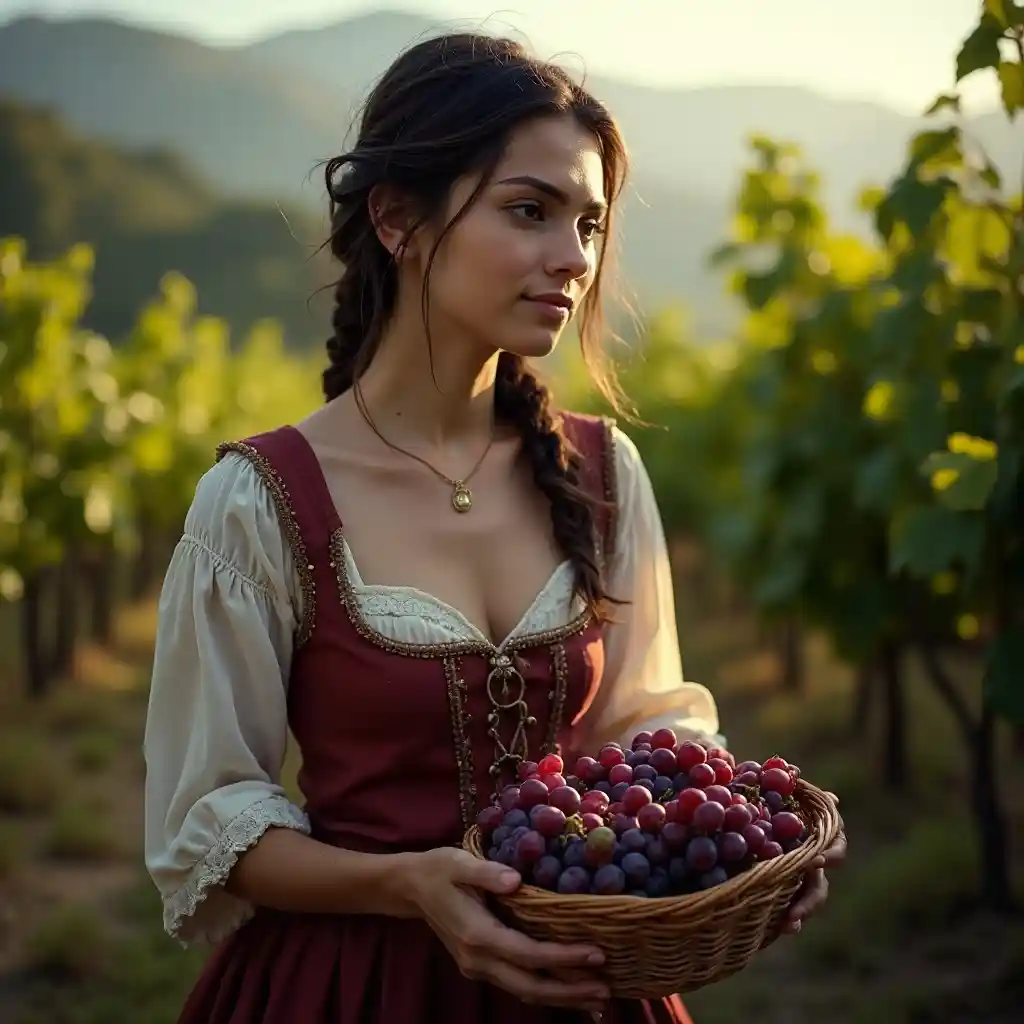 Portrett av en ung, mørk og vakker italiensk jente som dyrker røde druer fra Sicilia i det 17. århundre italienske folkelige bønderklær med lavt og full bryst, dramatisk belysning, dybde av feltet, vingårder med klart og regelmessig definert form i bakgrunnen. Druene bør ha en vakker, jevn struktur. Utrolig detaljerte, holder en kurv med druer i hendene, en vinkkurv med riktig tekst, druer i en kurv med vakre bær.