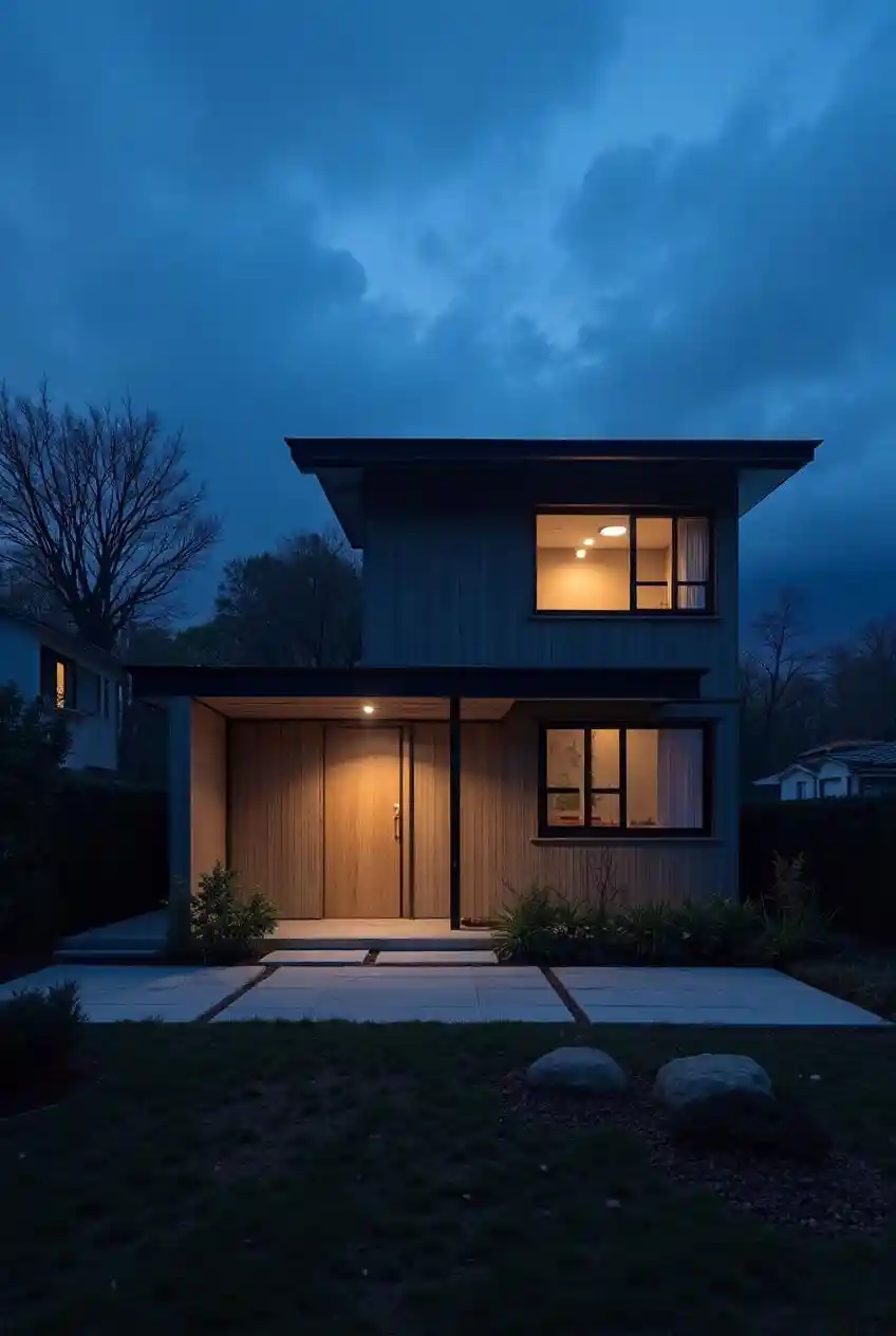 DavidMinimalistisk japansk hus, bilde på blå time skumring, mørkt