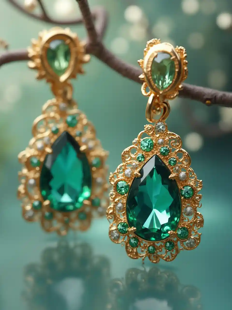 (Masterful Photo:1.3) av (Realistic:1.3) (juveler pendel øreringe), moderne smykker, store diamanter, smaragder, (gull), fioniter, Paraiba Tourmaline, vakker bakgrunn, mykt lys,Highly Detailed