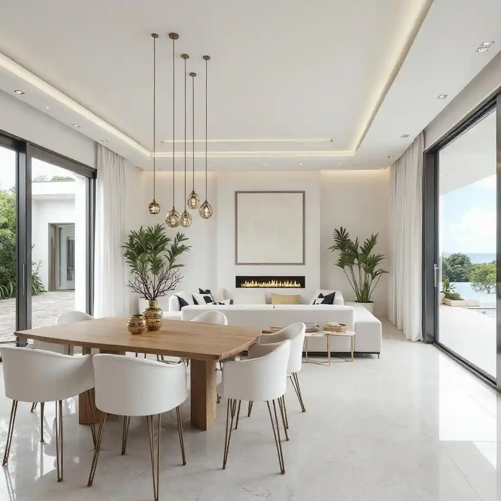 Et luksuriøst og moderne spisestue og stue i en villa med et hvitt og moderne tema, med et spisebord av tre og metall.
