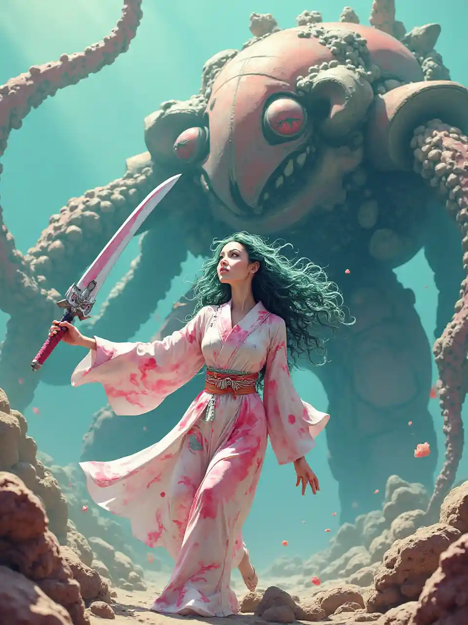 Fra lav vinkel, ser opp gjennom en vask av uklar akvarel som skildrer en sunken fremmed by, en engelen mecha ung kvinne med flytende cerulean tilfeldig farge langt krøllet hår, hennes blikk en blanding av gammel visdom og voldsom vilje, kledd i en rosa hvit mecha kimono kostym gjengd med myke akvarel blomster, kamper en kolossal lang hals mecha blekes med løs farge som antyder eksplosjoner og spredning avskrifter mens hun skjærer en tentakel med sitt massive mecha sverd.