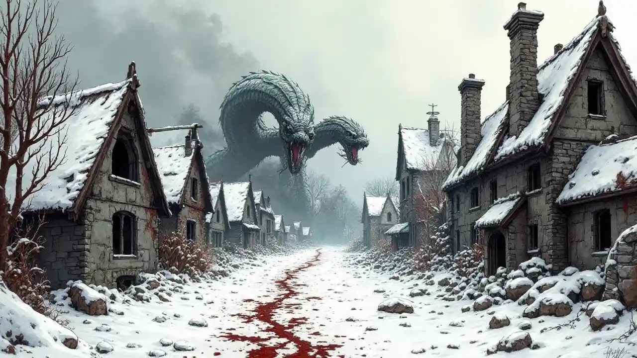 (brede bilde)), ((snekledd, delvis ødelagt, middelalderlandsby)) delvis kollapset hytter, gapende hull i vegger og splinter av tre spredt over snøen. Røyk stiger opp fra ruinene. I landsbyen gaten, en monstrøs (( *tohodet hydra *) knurrer, begge hodene på en kropp. Mørk rødt flekker på snø og vegger, et spor av mørk rødt mellom fotavtrykk. Snø pisker gjennom scenen. :: Dark Fantasy Horror Illustration :: ((Ink og grafit skisse stil)) :: ((Håndtegnet utseende)) av * Gerald Brom *, * Ian Miller *, *Zdzisław Beksiński * :: (((gritty tekstur))) :: (((mood atmosphere)) :: *gammel *, * voldelig * , *spøkende *, dæmpet farger