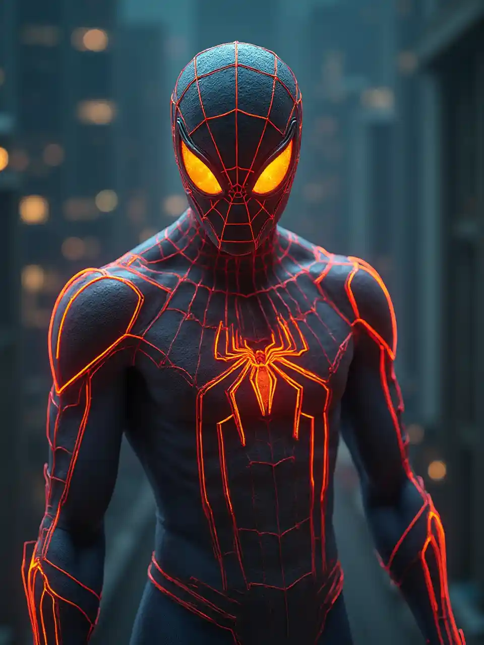 Spiderman i et oransje neon design, i stil med mørk grå og mørk cyan, RTX på, automatisme, elektrisk farge
