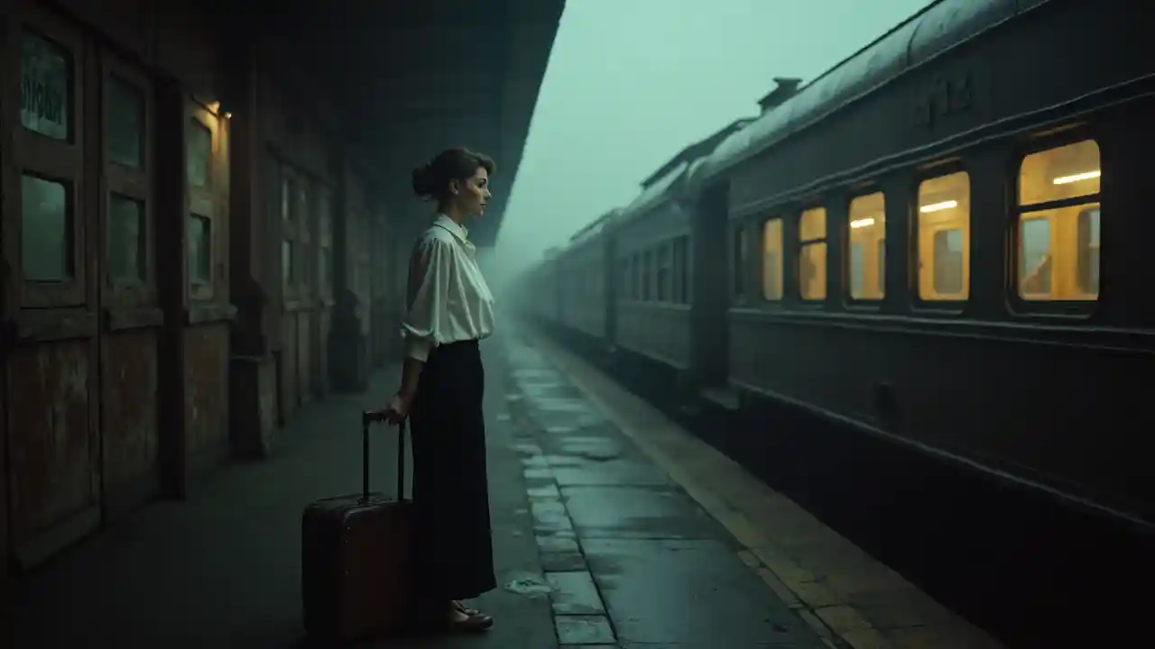 Mørk mystisk uheldig atmosfære. Mørk, dyster, tåkefull natt. En noir-inspirert profilvisning av en mystisk kvinne i skreddersydd hvit bluse fra 1930-tallet og svart blyantkjørt, som står ved en rustikk, gammel og forurenset togplattform med vintage bagasje, forbereder seg til å gå om bord på et 1929 tog med Polar hvite vogner, krom aksenter, og myk rav belysning, i en filmlig film med rik filmkorn, subtil vignet, og dramatisk farge gradering, som minner om Lee Jeffries's humør, Alessio Albis atmosfærisk belysning og Adrian Kuipers' episke komposisjoner.