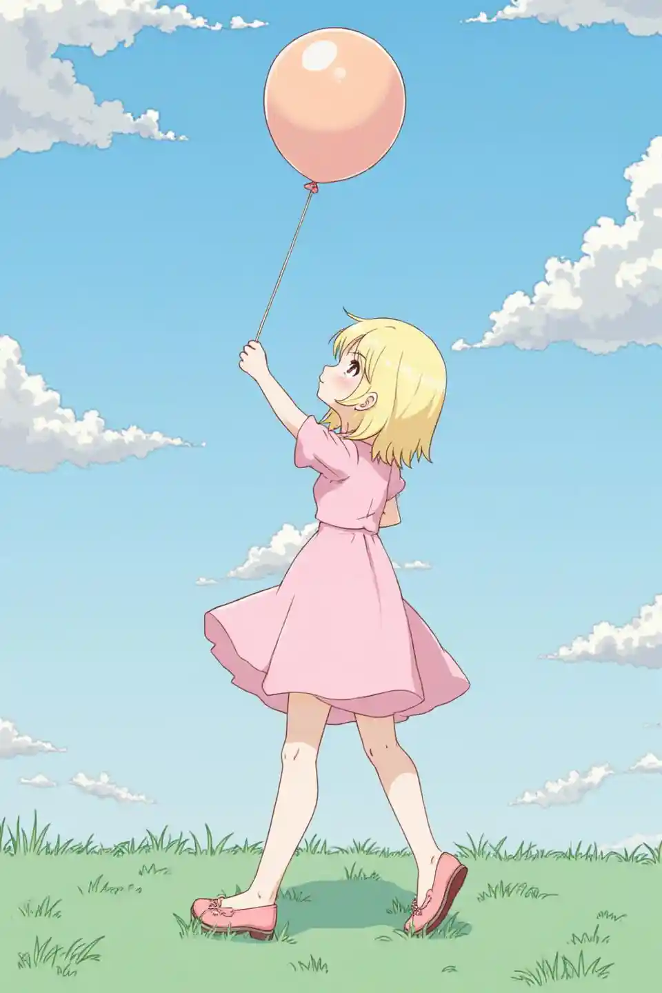 Høyere, absurdere, 1 jente, solo, solo fokus, lys hud, blondt hår, ser opp i himmelen, rosa kjole, rosa sko, full kroppsbilde, holder en ballon, side vie