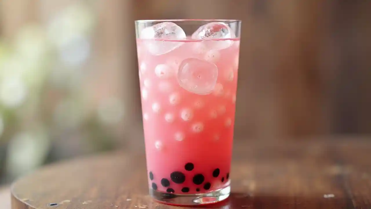 ChloeEt glass rosa boble te med is og tapioka perler.