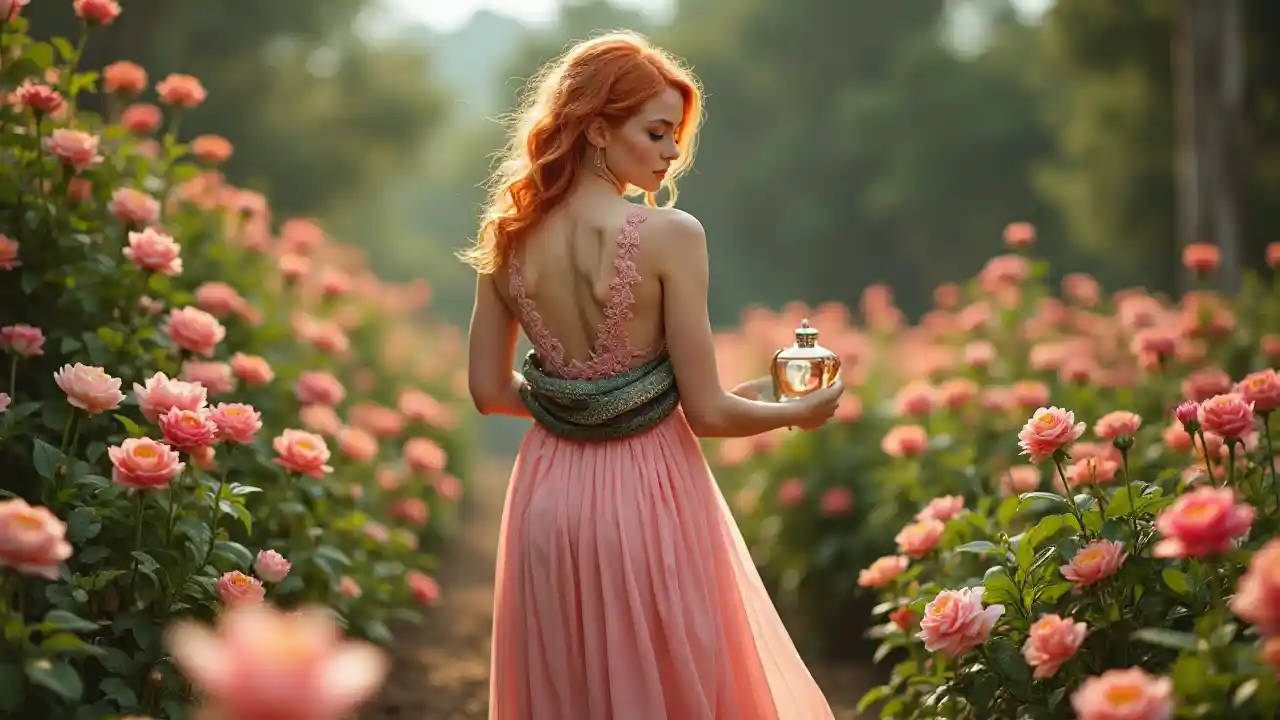 romantisk kledd kvinne i rosa kjole med oransje hår og slange viklet rundt halsen hennes holder en parfymflaske står i Edens hage med tusen blomster