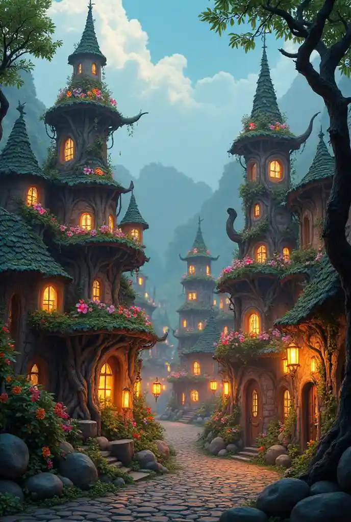 JocelynFantasy bybilde, magisk kanin by, glødende bures og tårn laget av vevd røtter og blomster, brostegner gater, linjer i form av gulv, levende p