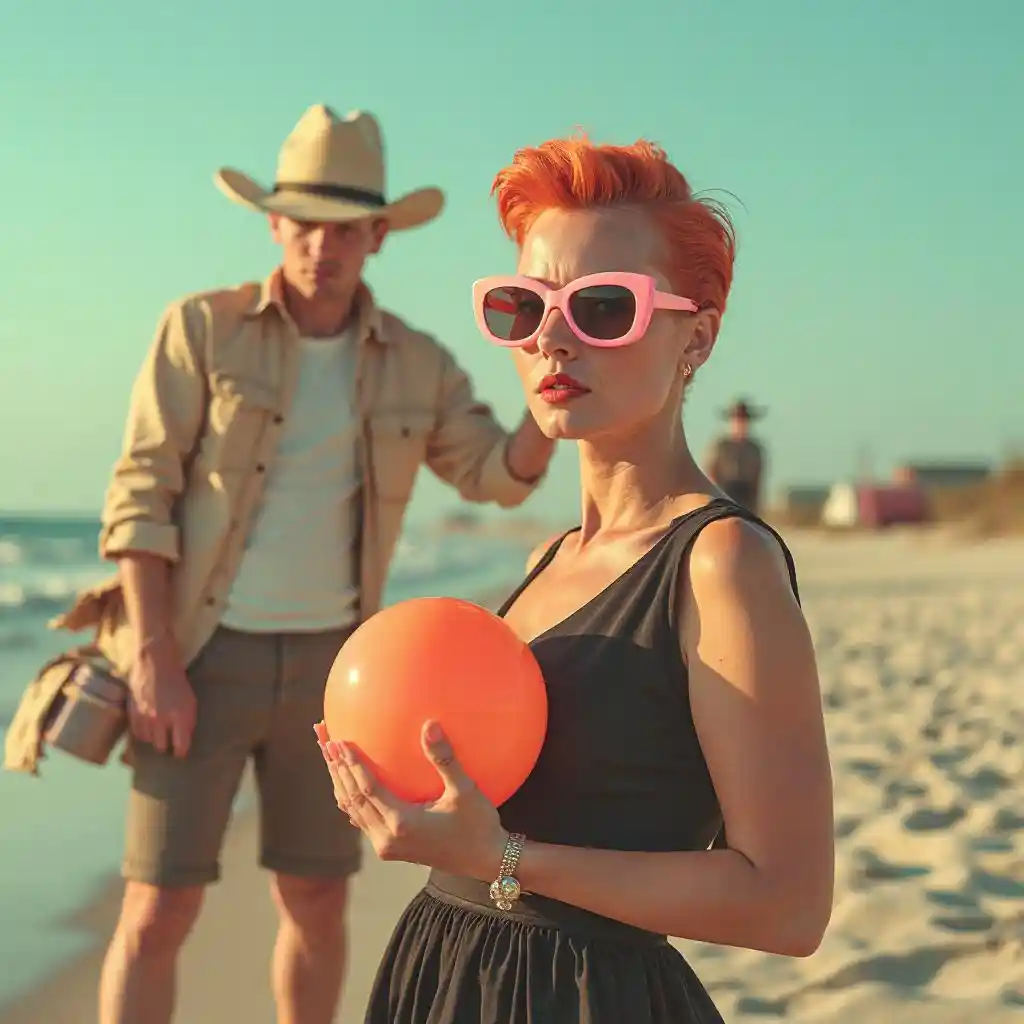 presenterer en interessant og surrealistisk scene som kan ha en rekke tolkninger, spesielt med sin retro, stilisert utseende. Fokus er en kvinne med slående oransje hår og overdrevet rosa solbriller, holder en lys oransje ball. Kledningen hennes, en mørk kjole med en vintage-følelse, kontrasterer med den livlige stranden, mens en annen figur, kledd i det som ser ut til å være en cowboy hat og moderne klær, står bak henne nær kysten, holder en kjøler og noen andre eiendeler. Stemningen føles med vilje skikkelig og uvanlig, blander forskjellige epoker og elementer av mote og kultur på en lekende eller surrealistisk måte. Historien bak denne scenen kan involvere temaer av nostalgi, kontrasterende tidslinjer, eller til og med en futuristisk inntrykk av retro. De store solbrillene og den dristige frisyren antyder en mote-forward karakter, mens den enslige stranden og tilstedeværelsen av den andre personen i bakgrunnen kan antyde en eksentrisk, nesten filmisk eller drømmelig atmosfære. Den kan bli sett på som en kommentar til sammenstøtet mellom modernitet og fortid, eller bare et iscenesatt, kunstnerisk skudd som skulle provosere nysgjerrighet og fantasi hos tilskueren.