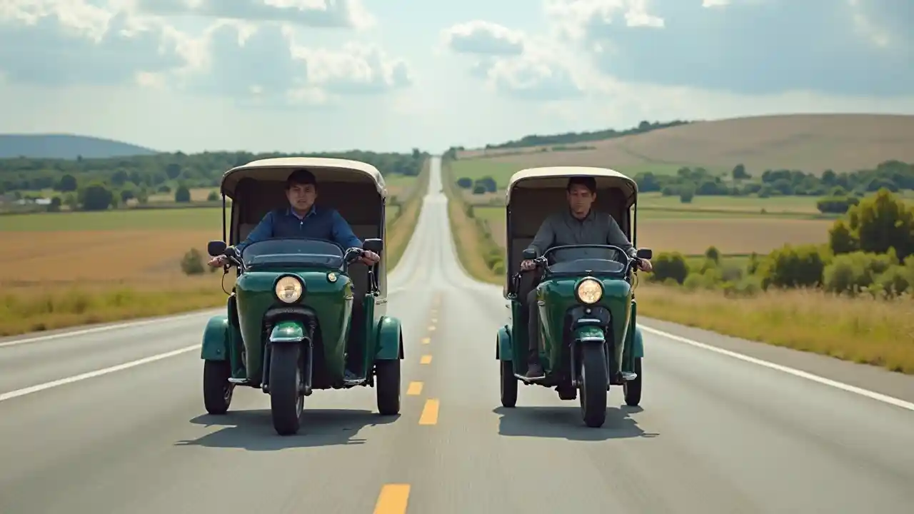 To personer kjører trehjulet kjøretøy på en motorvei i et landlig område på en solrik dag.