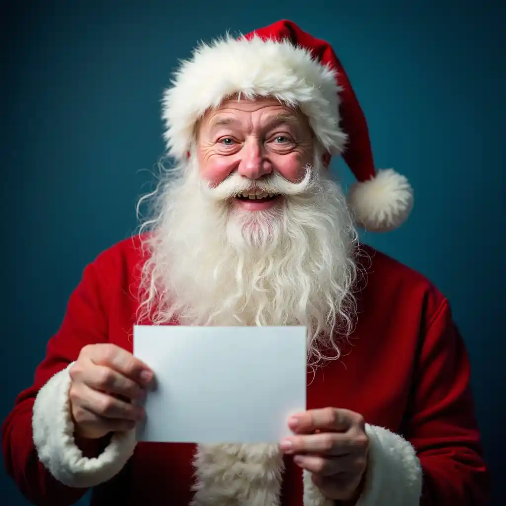 Portrett av julenissen som smiler, hvit bakgrunn, som holder et hvitt visittkort, et sjokkerende ansiktsuttrykk, flytende hvitt skjegg, munter karikatur, mettet farger, rødt antrekk, skarpt fokus, portrettfotografi, dybde av felt, dramatisk lys, utrolig detalj, blå bakgrunn, sløret bakgrunn,