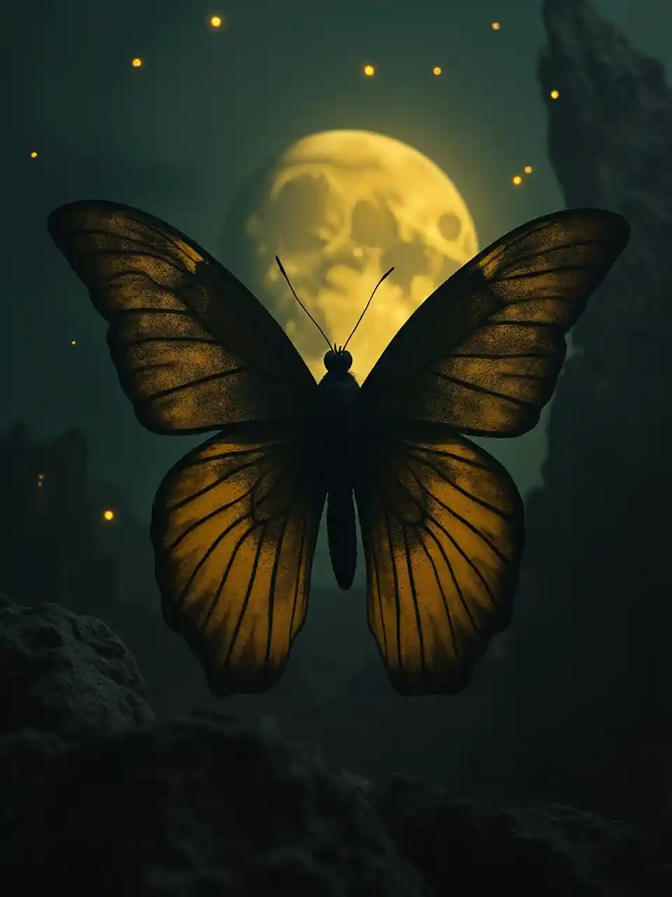 Den har lyse gule vinger, men er ond og lengter etter døden. mørk skygge bakte med gul måneskinn og stjerner, ((brede kamera)), lang avstand , lang skudd, venstre vinkel, stor dybde av felt. film korn, film tekstur.
