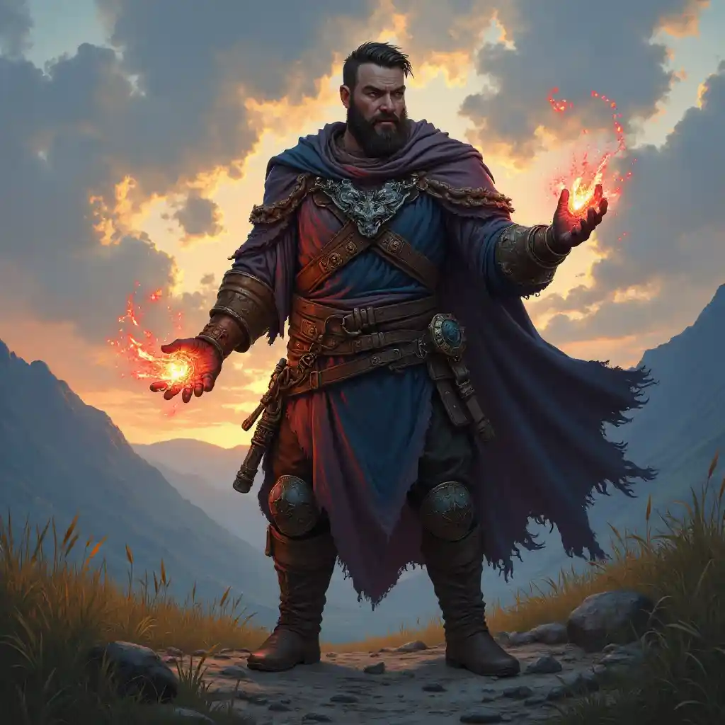 (Torso) Mannlig stakkede stor muskuløs 41 år gammel trollmann med kortklippet hår og skjegg, engasjert i kamp kaste en magisk-sjakk i hendene, står i en vindfylt dal sent i skumringen, Pathfinder, d&d setting, realistisk, forbedret skygge, fargerik