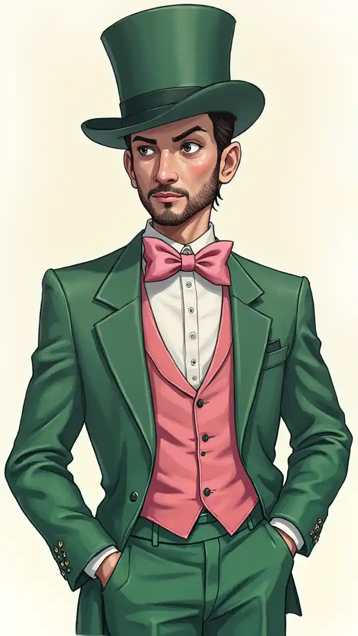 Illustrert portrett av en mann i topphatt, grønn dress med rosa vest og rosa slips.