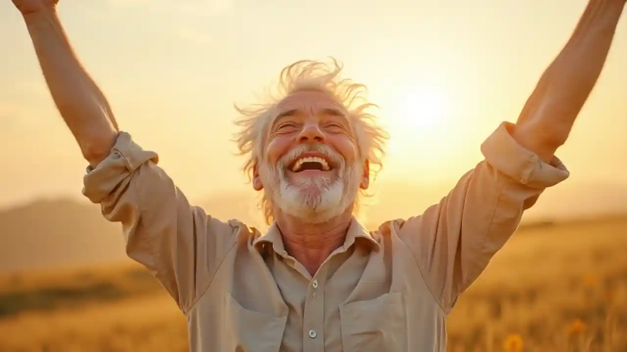 en gammel hvit mann med hvitt hår i velhair lykkelig, armer løftet i luften. Vakker bakgrunn av sol og sommer vibs