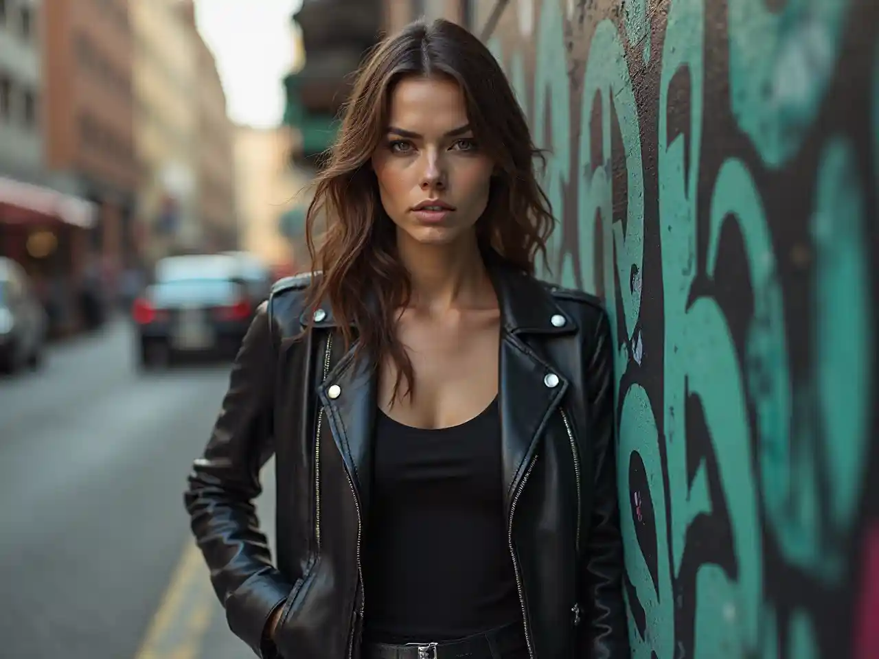 Forestill deg en kvinne i en svart skinnjakke som står trygg mot en vegg som er dekket av graffiti i en travel by. Hennes voldsomme uttrykk og uformelle antrekk gjør at hun skiller seg ut i det rå, urbane miljøet.