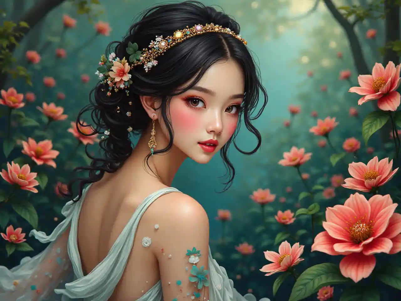 I dette levende og hyperdetaljerte kunstverket ser vi en ung asiatisk kvinne som er elegant stilt i en grønn hage, omgitt av et utal fargerike blomster og sjeldne, eksotiske planter. Huden hennes skinner med et eterisk glød, som om den er opplyst fra innsiden, og hennes mørke, glansende hår faller forsiktig i myke krøller ned ryggen. Hun er kledd i en flytende kjole pyntet med intrikate mønstre og et delikat hodebånd utsmykket med glitrende juveler.