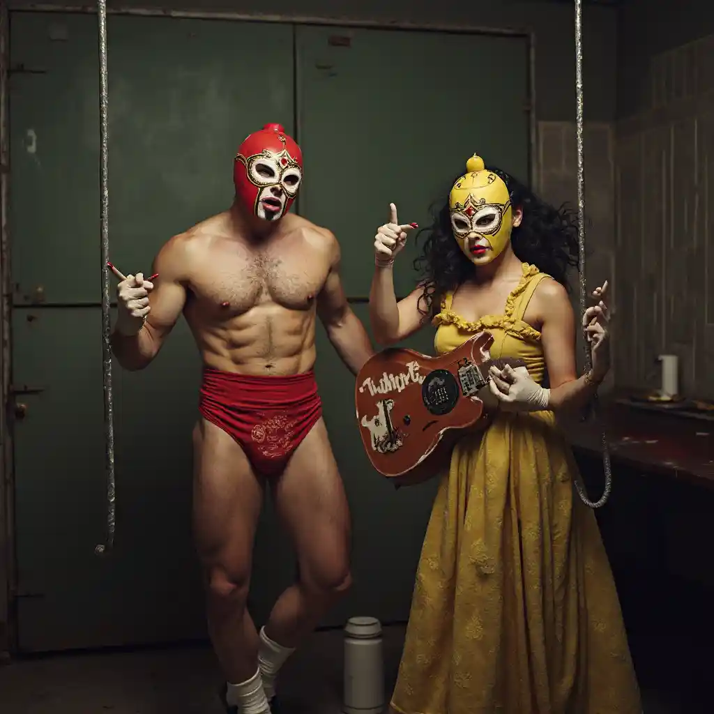 maskerte mannlige og kvinnelige luchadores brydere i en vintage 1950 fengsel scene, spiller et big band swing band i 1950s swing stil kostymer