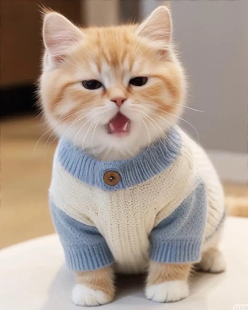 En sjarmerende liten katt, kledd i en søt blå og hvit strikkede trø, fanger hjerter mens den sitter på gulvet med munnen litt åpen. Scenen er helt fortryllende, for denne fluffy katten, med sine lyse øyne som gliter av nysgjerrighet, synes å komme til liv på en gledelig måte. Med magien fra kunstig intelligens, engasjerer denne søte katten seg med publikum, beveger leppene og skaper lyder som en livlig forestilling. Hver liten miau og sprang er perfekt synkronisert, slik at det ser ut som katten deler sine tanker eller synger en kjek melodi. De lekende uttrykkene og kjærlige kroppsspråket legger et lag sjarme, og inviterer til å le og smile. Du kan ikke unngå å bli fengslet av denne pelskjede superstjernen, hvis uimotståelige personlighet skinner gjennom når den deler sine sjokkerende "historier" på den mest underholdende måten!