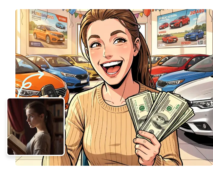 ਡੀਲ ਕਾਮਿਕਸ ਫਿਲਟਰ ਚੁਣੋ। AI ਆਪਣੇ ਆਪ ਡਾਲਰ, ਕਾਰ ਦੀਆਂ ਚਾਬੀਆਂ ਅਤੇ ਪਿਛੋਕੜ ਵਿੱਚ ਇੱਕ ਲਗਜ਼ਰੀ ਸਪੋਰਟਸ ਕਾਰ ਜੋੜਦਾ ਹੈ।