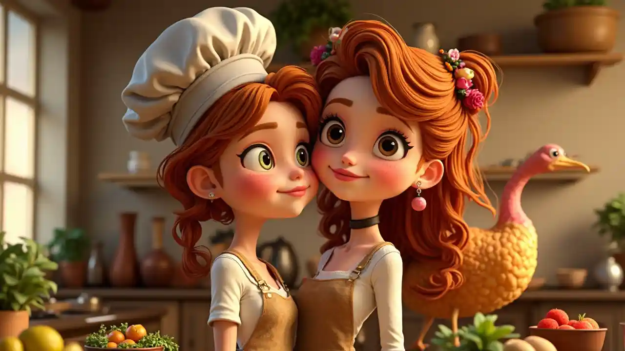 Prompt (3D-Realistic Animated Style – Whimsical Kitchen Scene): Two beautifully stylized young women with vibrant red hair stand close together in a warmly lit, rustic kitchen. One wears a classic white chef's hat and apron, her short tousled hair and wide eyes giving her a curious, innocent air. The other has long, flowing auburn curls adorned with colorful flowers, wearing a vintage-style dress with a dark choker, exuding confident elegance. A flamboyant turkey with extravagant plumage perches just behind them, its feathers rendered in dramatic detail. The scene is bathed in soft morning light from a nearby window, casting gentle shadows on the textured wooden shelves, fresh herbs, and kitchenware around them. The rendering style is cinematic and richly detailed, blending stylized human features with painterly realism — like a frame from a high-budget animated film. Style Tags: 3D stylized realism, Pixar-like, animated film aesthetic, digital sculpted faces, warm kitchen interior, expressive eyes, whimsical mood, cinematic render, fantasy realism, richly textured environment
