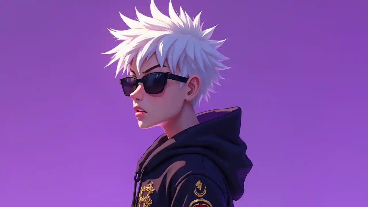 ਇੱਕ ਨੌਜਵਾਨ ਐਨੀਮੇ-ਸ਼ੈਲੀ ਦੇ 2 ਡੀ ਕਿਰਦਾਰ ਦਾ ਸਾਈਡ ਪ੍ਰੋਫਾਈਲ, ਛੋਟੇ ਚਿੱਟੇ ਤਿੱਖੇ ਵਾਲਾਂ ਨਾਲ, ਅੰਦਾਜ਼ ਹਨੇਰੇ ਗਲਾਸ ਅਤੇ ਇੱਕ ਕਾਲਾ ਹੈ. ਕਿਰਦਾਰ ਦਾ ਪ੍ਰਗਟਾਵਾ ਗੰਭੀਰ ਅਤੇ ਕੇਂਦ੍ਰਿਤ ਹੈ, ਜੋ ਕਿ ਇੱਕ ਜੀਵੰਤ ਵਾਇਲਟ ਗ੍ਰੈਡਿਏਟ ਪਿਛੋਕੜ ਦੇ ਵਿਰੁੱਧ ਹੈ. ਇਹ ਹੈਵੀਟਾਈਜ਼ ਇੱਕ ਆਧੁਨਿਕ, ਸਾਫ਼ ਕਲਾ ਸ਼ੈਲੀ ਦੇ ਨਾਲ ਇੱਕ ਆਲੀਸ਼ਾਨ ਅਤੇ ਕਲਾਤਮਕ ਭਾਵਨਾ ਲਈ ਲਗਜ਼ਰੀ ਵਰਗੇ ਡਿਜ਼ਾਈਨ ਹਨ