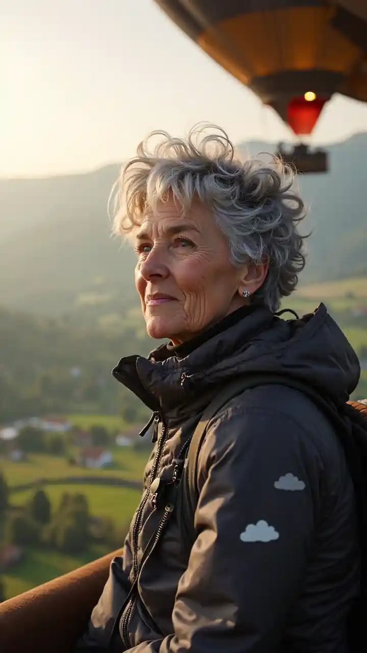 66 ਸਾਲਾ ਯੂਰਪੀਅਨ ਔਰਤ ਚਾਂਦੀ ਦੇ ਕਰਲ ਨਾਲ ਇੱਕ ਧੁੰਦਲੀ ਘਾਟੀ ਉੱਤੇ ਗਰਮ ਹਵਾ ਵਾਲਾ ਬੈਲੂਨ ਚਲਾਉਂਦੀ ਹੈ। ਚੜ੍ਹਨ ਵਾਲੀਆਂ ਪਹਾੜੀਆਂ ਅਤੇ ਸਵੇਰ ਦੀ ਰੌਸ਼ਨੀ ਉਸ ਨੂੰ ਢਾਲਦੀਆਂ ਹਨ, ਉਸ ਦੀ ਨਿਰੰਤਰ ਖਿੱਚ ਇੱਕ ਸ਼ਾਂਤ, ਕੁਦਰਤੀ ਸੈਟਿੰਗ ਵਿੱਚ ਸਾਹ ਅਤੇ ਸ਼ਾਂਤ ਹਿੰਮਤ ਨੂੰ ਪ੍ਰਕਾਸ਼ਿਤ ਕਰਦੀ ਹੈ। ਉਸ ਦੀਆਂ ਅੱਖਾਂ ਹੈਰਾਨ ਹੋ ਕੇ ਚਮਕਦੀਆਂ ਹਨ।