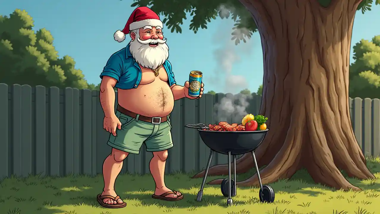 ਸੰਤਾ ਨੇ ਸ਼ਾਰਟਸ ਪਹਿਨੇ, ਇੱਕ ਛੋਟੀ ਆੰਕੜੀ ਵਾਲੀ ਨੀਲੀ ਕਮੀਜ਼, ਅਤੇ ਫਲੌਪ ਪਹਿਨੇ, ਇੱਕ ਛੋਟੇ ਬਰਬਿਕ ਉੱਤੇ ਸਲਾਸ ਪਕਾ ਰਹੇ ਹਨ। ਉਹ ਆਸਟ੍ਰੇਲੀਆਈ ਭੂਤ ਗਮ ਦੇ ਦਰੱਖਤ ਦੇ ਕੋਲ ਘਾਹ ਉੱਤੇ ਖੜ੍ਹਾ ਹੈ, ਉਸਦੇ ਪਿੱਛੇ ਇੱਕ ਬਾਗ ਅਤੇ ਇੱਕ ਨੀਲਾ ਅਸਮਾਨ ਹੈ. ਉਹ ਇੱਕ ਹੱਥ ਵਿੱਚ ਬੀਅਰ ਦਾ ਡੱਬਾ ਅਤੇ ਦੂਜੇ ਹੱਥ ਵਿੱਚ ਮੈਟਲ ਬਾਰਬਿਕ ਟੈਂਜ ਰੱਖਦਾ ਹੈ