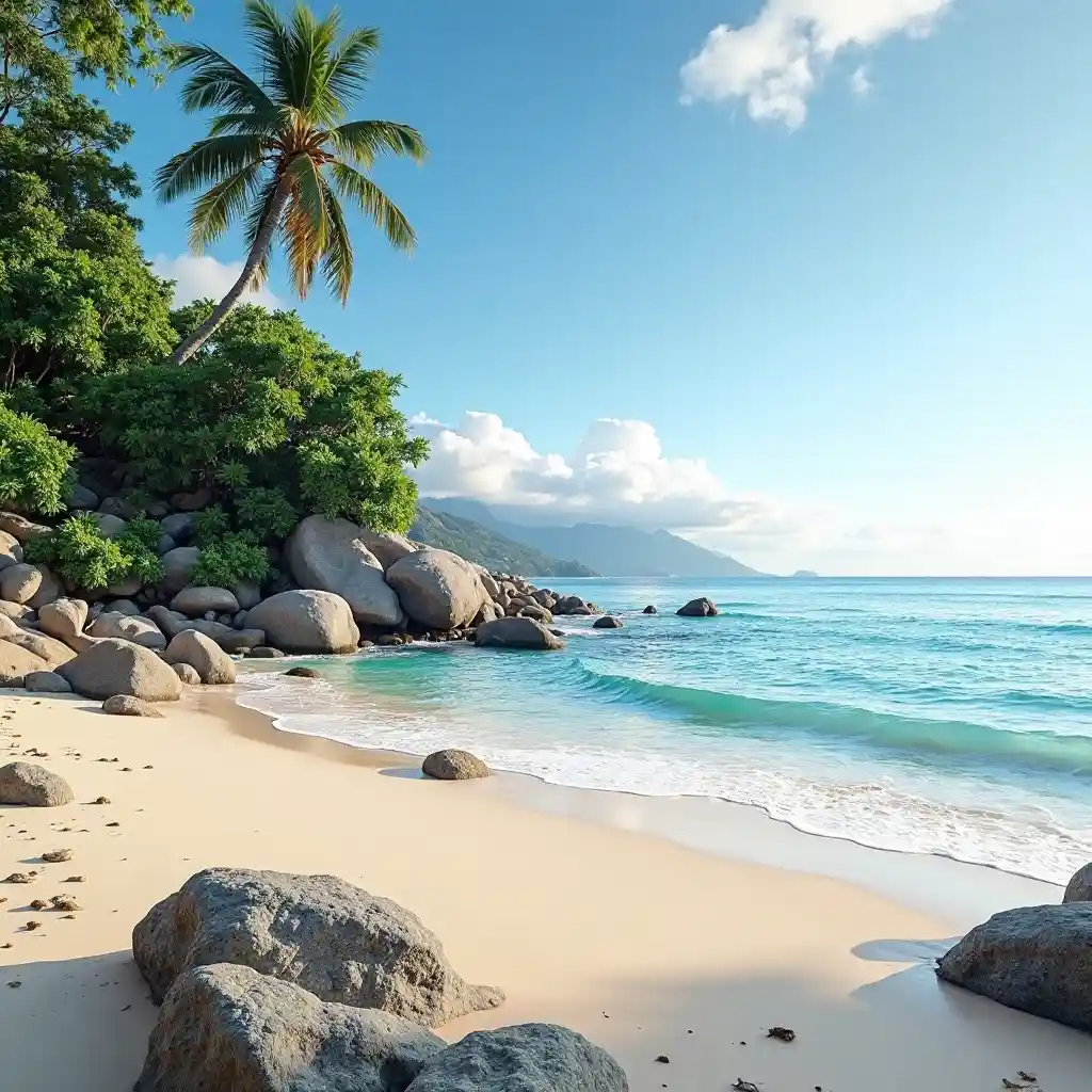 ਚੱਟਾਨਾਂ ਅਤੇ ਖਜੂਰਾਂ ਦੇ ਰੁੱਖਾਂ ਨਾਲ ਇੱਕ ਵਧੀਆ ਸਮੁੰਦਰੀ ਕੰ