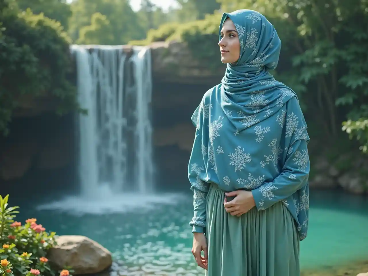 ਇੱਕ ਬਹੁਤ ਹੀ ਸੁੰਦਰ ਮੁਸਲਮਾਨ ਨੀਲੀਆਂ ਅੱਖਾਂ ਅਤੇ ਨੀਲੇ ਸਿਰ ਦੇ ਪਟੜੇ ਨਾਲ, ਇੱਕ ਲੰਬੀ ਹਲਕੀ ਹਰੀ ਪਟੜੀ, ਇੱਕ ਸੁੰਦਰ ਝਰਨੇ ਦੇ ਕੋਲ ਖੜ੍ਹਾ ਹੈ, ਉਥੇ ਫੁੱਲ ਅਤੇ ਰੁੱਖ ਹਨ