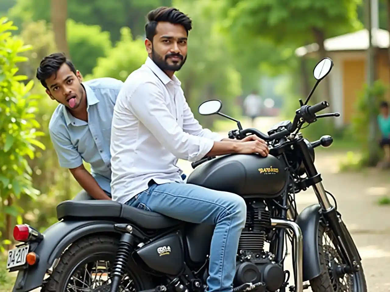 ਇੱਕ ਨੌਜਵਾਨ ਇੱਕ ਸੁਨਹਿਰੀ ਕਾਲੇ ਰਾਇਲ ਐਨਫਿਲਡ ਮੋਟਰਸਾਈਕਲ ਉੱਤੇ ਆਤਮਵਿਸ਼ਵਾਸ ਨਾਲ ਬੈਠਾ ਹੈ। ਉਹ ਇੱਕ ਚਮਕਦਾਰ ਚਿੱਟੀ ਕਮੀਜ਼ ਅਤੇ ਆਮ ਜੈਨਸ ਪਹਿਨੇ ਹੋਏ ਹਨ, ਜਿਸ ਵਿੱਚ ਸਧਾਰਨ ਸੈਂਡਲ ਹਨ, ਜਦੋਂ ਉਹ ਗੰਭੀਰਤਾ ਨਾਲ ਕੈਮਰੇ ਵੱਲ ਵੇਖਦੇ ਹਨ। ਦੂਜਾ ਵਿਅਕਤੀ ਆਪਣੀ ਜੀਭ ਬਾਹਰ ਕੱਢਦਾ ਹੈ। ਇਹ ਦ੍ਰਿਸ਼ ਇਕ ਧੁੱਪ ਵਾਲੇ ਦਿਨ ਬਾਹਰ ਹੈ, ਜਿਸ ਵਿਚ ਹਰੇ-ਹਰੇ ਪੱਤੇ ਅਤੇ ਗੁਆਂਢੀਆਂ ਦੀਆਂ ਕੁਝ ਦਿਖਾਈ ਦੇਣ ਵਾਲੀਆਂ ਬਣਤਰਾਂ ਹਨ, ਜੋ ਕਿ ਰਚਨਾ ਨੂੰ ਇੱਕ ਜੀਵਤ, ਜੀਵੰਤ ਭਾਵਨਾ ਪ੍ਰਦਾਨ ਕਰਦੇ ਹਨ। ਮੋਟਰਸਾਈਕਲ ਦੀ ਸਖ਼ਤ ਡਿਜ਼ਾਇਨ, ਆਮ ਪਹਿਰਾਵੇ ਅਤੇ ਖੇਡਣ ਵਾਲੇ ਆਪਸੀ ਤਾਲਮੇਲ ਨਾਲ ਜਵਾਨੀ ਦੇ ਸਮੇਂ ਦੀ ਸੰਕੇਤ ਮਿਲਦੀ ਹੈ।