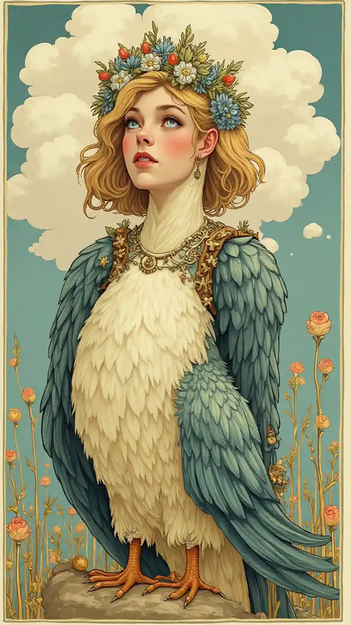 ਇੱਕ ਰੂਸੀ ਪਰੀ ਕਹਾਣੀ ਦਾ ਚਿੱਤਰ, ਇੱਕ ਸੁੰਦਰ ਕੁੜੀ ਜਿਸ ਦੇ ਸਿਰ ਉੱਤੇ ਤਾਜ ਅਤੇ ਪੰਛੀ ਦਾ ਸਰੀਰ ਹੈ