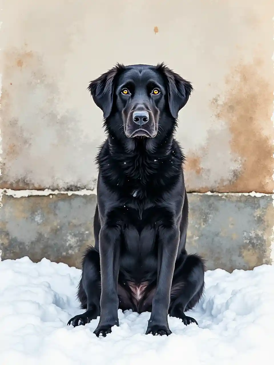 Cooperਇੱਕ ਕੰਧ ਦੇ ਸਾਹਮਣੇ ਬਰਫ ਵਿੱਚ ਬੈਠੇ ਕਾਲੇ ਕੁੱਤੇ, ਇੱਕ ਵਾਟਰਲ ਪੇਂਟਿੰਗ ਦੇ ਰੂਪ ਵਿੱਚ, ਸਾਹਮਣੇ ਤੋਂ ਦੇਖਿਆ ਗਿਆ