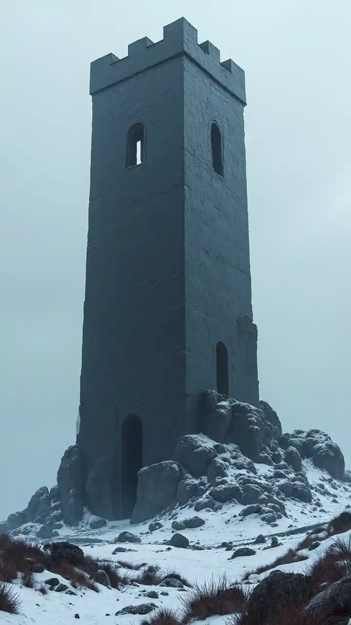 ਇੱਕ ਪੁਰਾਣਾ ਮੋਨੋਲੀਥਿਕ ਕੈਸਲ ਟਾਵਰ, ਜੋ ਕਿ ਪਾਲਿਸ਼ ਕੀਤੇ ਕਾਲੇ ਪੱਥਰ ਦੇ ਇੱਕ ਸਿੰਗਲ ਨਿਰਵਿਘਨ ਟੁਕੜੇ ਤੋਂ ਬਣਿਆ ਹੈ, ਜੋ ਕਿ ਇੱਕ ਠੰਡੇ ਅਤੇ ਬੇਰਹਿ ਟੁੰਡਰਾ ਉੱਤੇ ਹੈ। ਭੁੱਲਿਆ ਅਤੇ ਛੱਡਿਆ, ਪਰ ਸੁਰੱਖਿਅਤ ਅਤੇ ਅਚਾਨਕ.
