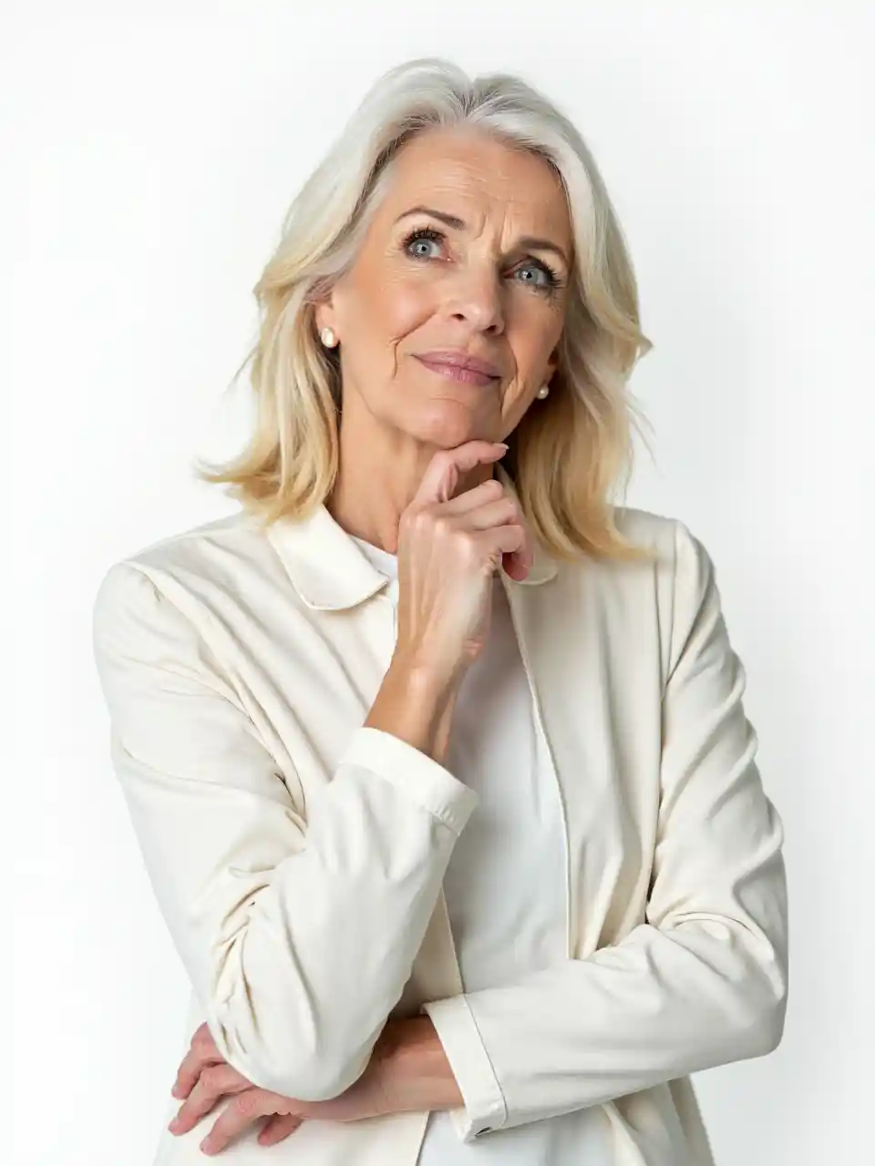 ਮੱਧ ਉਮਰ ਦੀ ਧੋਨੀ ਔਰਤ ਕਿਸੇ ਚੀਜ਼ ਬਾਰੇ ਸੋਚਦੀ ਹੈ ਹੱਥ ਨੂੰ ਆਪਣੇ ਚਿਹਰੇ ਦੇ ਨੇੜੇ ਰੱਖਦੀ ਹੈ, ਚਿੱਟੇ ਵਾਲ, ਚਿੱਟੇ ਜੈਕਟ, ਸਿਆਣੇ ਮਹਿਲਾ, ਅਲੱਗ, ਚਿੱਟੇ ਪਿਛੋਕੜ
