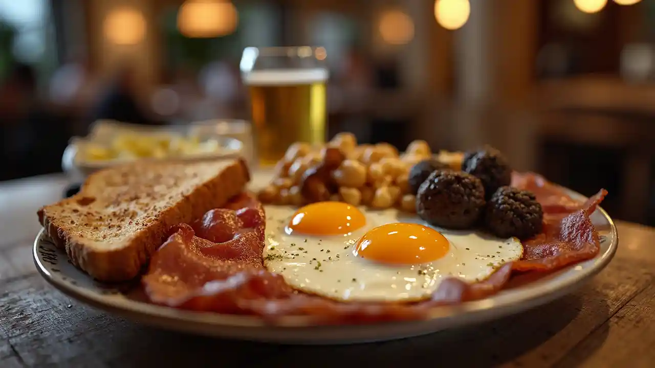 ਫ੍ਰਾਈਟਡ ਅੰਡੇ ਅਤੇ ਬੇਕਨ ਅਤੇ ਹੈਸ਼ ਬ੍ਰਾਉਨ ਅਤੇ ਕਾਲੇ ਪੂਡਿੰਗ ਅਤੇ ਮਸ਼ਰੂਮਜ਼ ਅਤੇ ਟੋਸਟ ਦੀ ਇੱਕ ਉਤਪਾਦ ਫੋਟੋ, ਫੋਟੋ-ਯਥਾਰਥਵਾਦੀ, ਬਹੁਤ ਵਿਸਥਾਰ, ਰੈਸਟੋਰੈਂਟ ਦੀ ਪਿੱਠਭੂਮੀ, ਸਟੂਡੀਓ ਲਾਈਟਿੰਗ, ਕੈਨਨ 5 ਡੀ ਮਾਰਕ III, ਕੈਨਨ 85mm ਪ੍ਰਾਈਮ ਲੈਂਜ਼