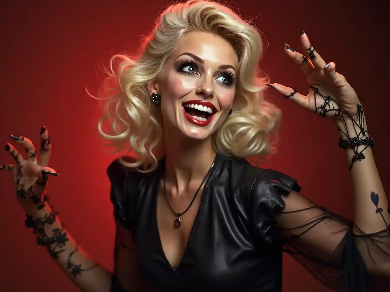 Scarlettਬ੍ਰਿਗੇਟ ਬਾਰਡੋ ਇੱਕ ਦੁਸ਼ਟ ਕਿਰਦਾਰ ਵਜੋਂ, ਇੱਕ ਡਰਾਉਣੀ ਹੈਲੋਵੀਨ ਕਸਟਮ ਵਿੱਚ, ਡਰਾਉਣੀ ਮੁਸਕਰਾਹਟ, ਰੀਟਰੋ ਸ਼ੈਲੀ, ਫ੍ਰੈਂਚ ਸ਼ੈਲੀ, 60 ਦੇ ਦਹਾਕੇ, ਜੀਵੰਤ ਸੰਤ੍ਰਿਪਤ ਰੰਗ