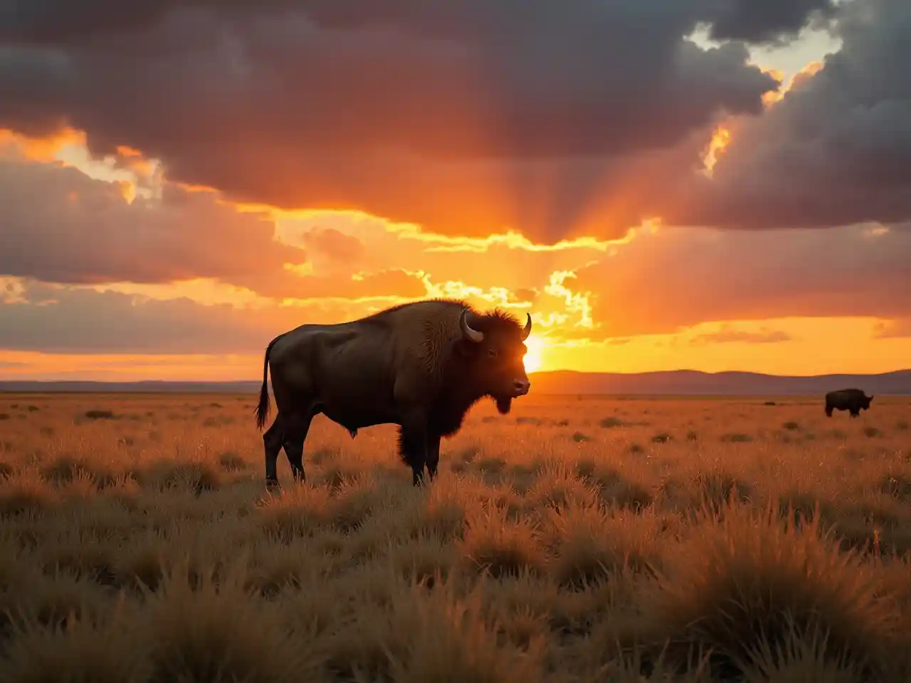 (ਬਿਫੌਲੋ ਓਪਨ ਰੇਂਜ ਤੇ), ਵਿਸ਼ਾਲ ਖੁੱਲਾ ਦ੍ਰਿਸ਼, ਹਵਾ ਵਿੱਚ ਹਿਲਾਉਣ ਵਾਲੇ ਸੋਨੇ ਦੇ ਮੈਦਾਨਾਂ, ਸੂਰਜ ਡੁੱਬਣ ਵੇਲੇ ਸੰਤਰੀ ਅਤੇ ਜਾਮਨੀ ਰੰਗ ਦੇ ਚਮਕਦਾਰ ਰੰਗਾਂ ਵਾਲਾ ਸ਼ਾਨਦਾਰ ਅਸਮਾਨ, ਸ਼ਾਂਤ ਮਾਹੌਲ, ਖਿੱਲਰੇ ਜੰਗਲੀ ਫੁੱਲ, ਉੱਚ ਵੇਰਵੇ, ਅਤਿ-ਵਸਥਿਤ, 4K ਰੈਜ਼ੋਲਿਸ਼ਨ, ਕੁਦਰਤ ਦੀ ਮਹਿਮਾ ਅਤੇ ਜੰਗਲੀ ਜੀਵਣ ਦੀ ਸ਼ਾਂਤੀ 'ਤੇ ਜ਼ੋਰ ਦਿੰਦੀ ਹੈ।